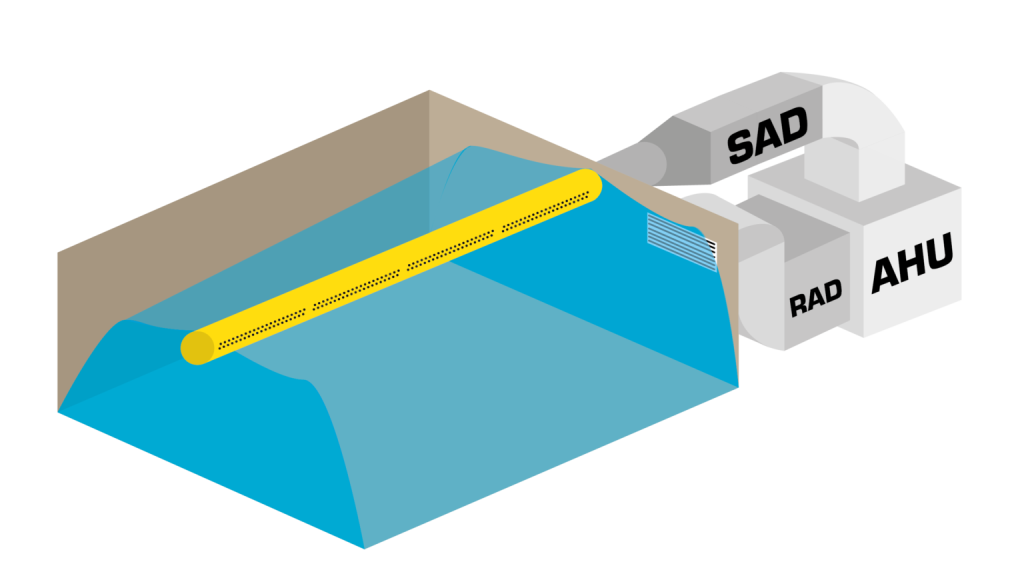 In-depth knowledge of air flows in fabric ducts and spaces forms the foundation of our work. We have launched a range of completely new technological solutions and own several patents. We can furnish our fabric ducting with any special color or motif.